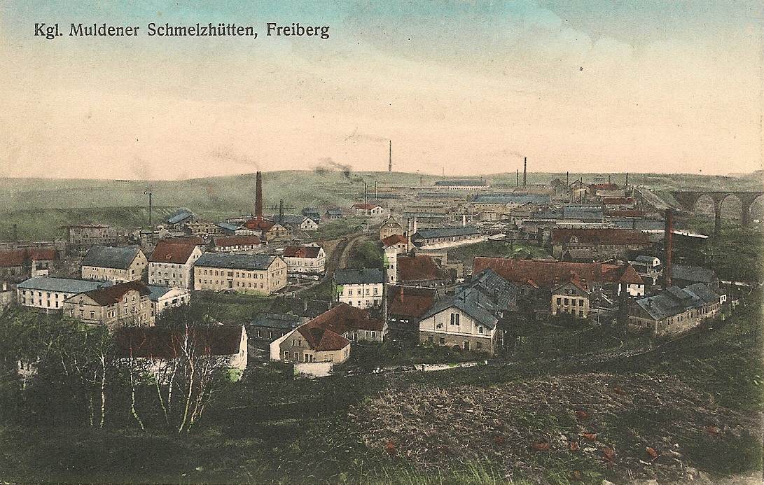 Hütte Muldenhütten um 1910 Im Vordergrund die ehemalige Schachtofenhütte (Quergebäude)